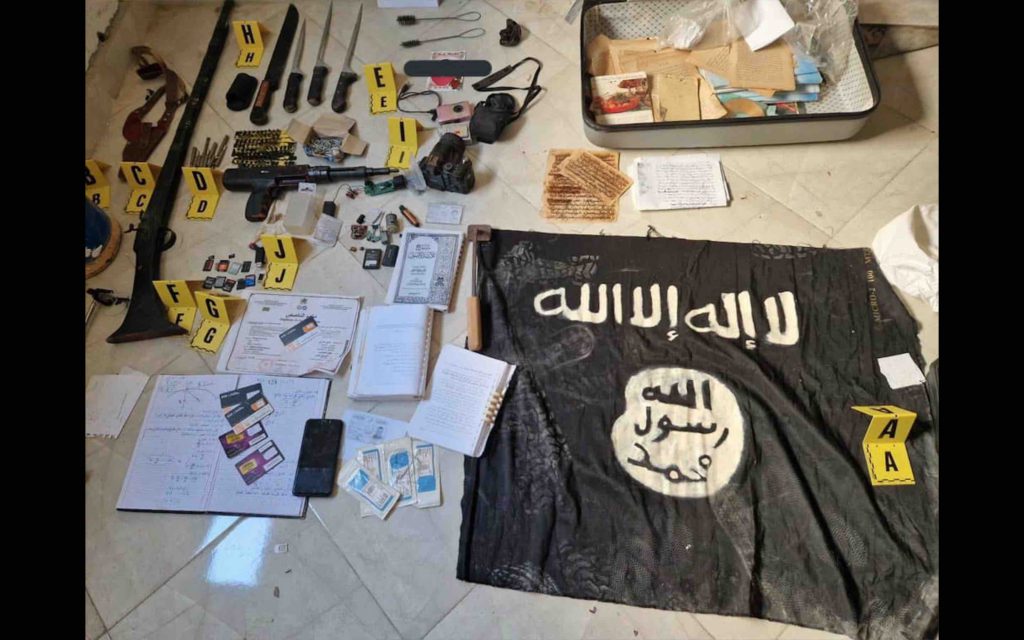 Les perquisitions menées dans la chambre occupée par le prévenu ont permis la saisie d’armes et de publications à caractère extrémiste, dont la perceuse utilisée dans l’agression, un tissu noir portant le soi-disant “étendard” de l’organisation terroriste “Daech”, un fusil artisanal à poudre noire, quatre armes blanches de différentes tailles, des objets contendants en fer et un étui en cuir pour pistolet.