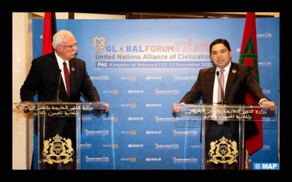 Le ministre des Affaires étrangères, de la Coopération africaine et des Marocains résidant à l’étranger, Nasser Bourita s’est entretenu, mardi à Fès, avec le ministre palestinien des Affaires étrangères, Riyad Al-Maliki, en marge des travaux du 9ème Forum mondial de l’Alliance des civilisations des Nations Unies (UNAOC).