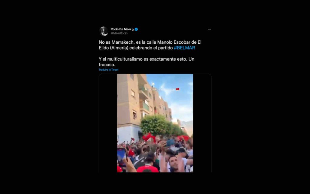 « Ce n’est pas Marrakech, c’est la rue Manolo Escobar à El Ejido (Almeria) qui célèbre la victoire du Maroc sur la Belgique. Et c’est exactement ça, le multiculturalisme. Un échec », a tweeté la députée du parti espagnol d’extrême droite Vox, Rocío De Meer, en légende d’une vidéo dans laquelle on peut voir des centaines de Marocains de cette ville manifester leur joie après la victoire de leur équipe nationale.