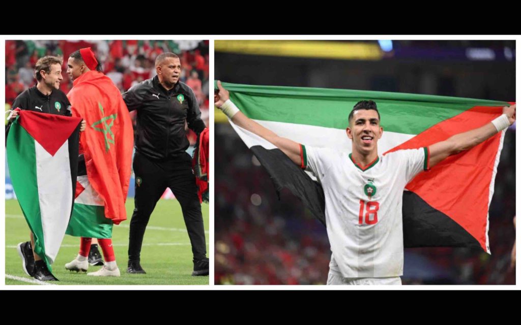 Les joueurs marocains ont plusieurs fois célébré leurs victoires au Mondial 2022 en brandissant à la fois des drapeaux palestiniens et marocains.