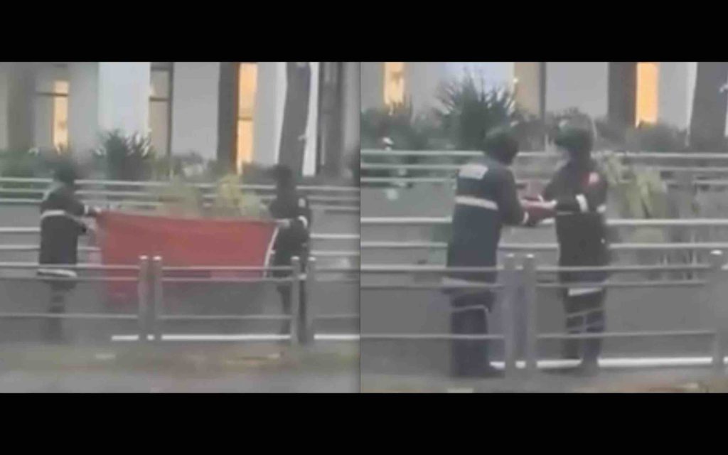 Les deux agents ont été filmés se précipitant pour ramasser le drapeau national arraché de son support par des vents forts et une pluie battante.