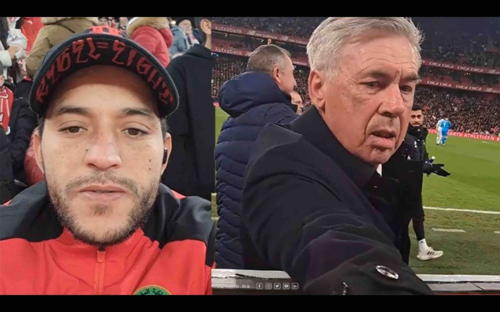 Au cours du match entre l’Athletic Bilbao et le Real Madrid qui se jouait pour le Championnat d’Espagne, un supporter marocain habillé en survêtement des Lions de l’Atlas s’est approché de l’entraîneur du Real Madrid, Carlo Ancelotti, pour lui demander un chewing-gum.