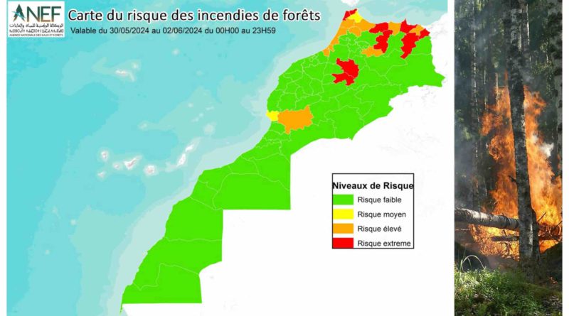 L’Agence nationale des eaux et forêts a annoncé un risque «moyen» à «extrême» d’incendies de forêt dans plusieurs provinces du Royaume du Maroc jusqu’au 2 juin 2024.